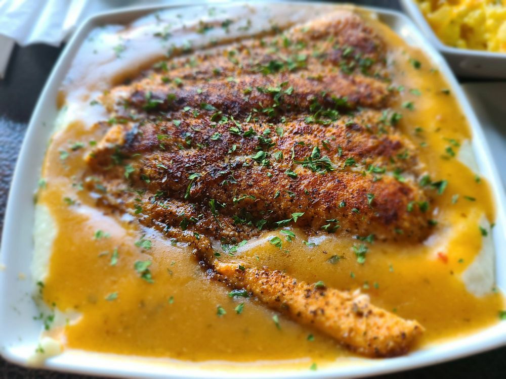 The servers were pleasant and friendly. Our food was delivered quickly. The presentation was beautiful, and the food was served hot! We order appetizers and our entrees at the same time. We shared 1 crabcake and an order of Salmon Taquitos. The crab cake was delicious and the Taquitos were AMAZING. For our entrees, I had Salmon and Grits. The Salmon could be breaded and fried or grilled. I chose to have it fried, the salmon was melt in your mouth good and the grits were almost better than my grandmother’s grits Super Creamy and delicious. My husband had Grilled Salmon and Shrimp on a bed of Mashed potatoes. The presentation was lovely and he loved his meal. To drink, I just had water and he had a diet Coke, boring I know. We sat near the bar and all the beautiful drinks were flowing from the full service bar that almost spanned the length of the restaurant. Drinks for us next time.